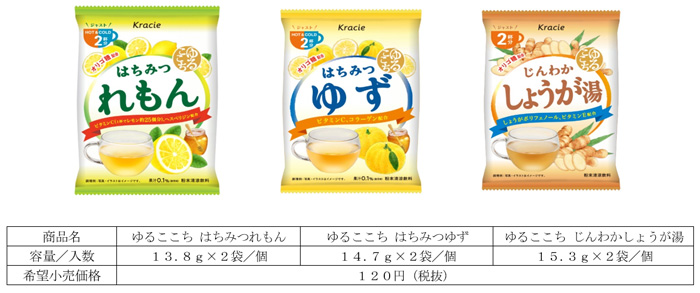 クラシエフーズは、水やお湯に溶かすだけで簡単に楽しめる粉末飲料の新シリーズ「ゆるここち」(各2袋入り・120円)を、9月7日に全国のスーパーマーケット、ドラッグストア、コンビニエンスストアなどで発売いたします。味は、「はちみつれもん」、「はちみつゆず」、「じんわかしょうが湯」の3種類です。