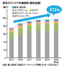 近年、男性の美容意識の高まりに伴い、男性ボディケア市場は伸長しています。中でも、むだ毛処理剤の2019年の市場規模は2.5億円で、2015年と比較すると3倍以上、拡大しています。