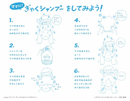“逆シャンプー”は、子どもがセルフシャンプーの練習をするためにママの髪を洗うことです。「おやこの時間セット」に付属する「絵本」の中で紹介されている“逆シャンプー”に親子で挑戦し、そのエピソードを投稿した方の中から抽選で30名さまに「mä&më Latte スペシャルセット」をプレゼントいたします。