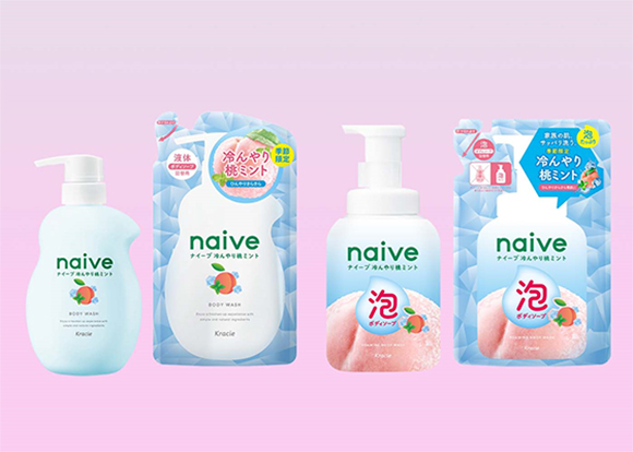 「ナイーブ」は洗う成分100%植物生まれのやさしい泡で、家族みんなの肌をサッパリなめらかに洗うボディソープです。「冷んやり桃ミント」は、ブランドの最大の特長である“サッパリ”を生かしつつ、「桃果汁&ミントエキス」(うるおい成分)と「メントール」(清涼成分)を配合し、ジメジメと暑い日本の夏も過ごしやすくなるような、冷んやり感のあるすっきりとした洗い心地を実現。ベタつきが気になる夏の肌を、冷んやりさらさら素肌へ導きます。