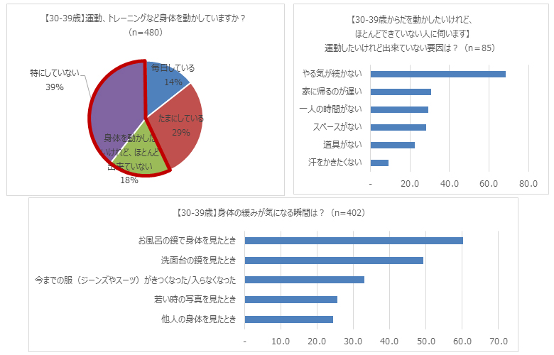 開発担当者を含め、特に30代には運動不足を感じている方が多く、運動したいと思いながら実現できない要因に「やる気が続かない」というメンタル面の弊害だけでなく、「時間・場所・道具がない」という悩みがあることも分かりました(2021年当社調べ)。また、体の緩みが気になる瞬間の第1位は「お風呂場の鏡で体を見たとき」です。「ダンベルボディソープ」は、忙しい30代の方を中心に運動不足を感じている方々へ向け、特別な時間と場所は不要、体の緩みが気になったその瞬間、その場で手軽にトレーニングができるように、という想いから誕生しました。