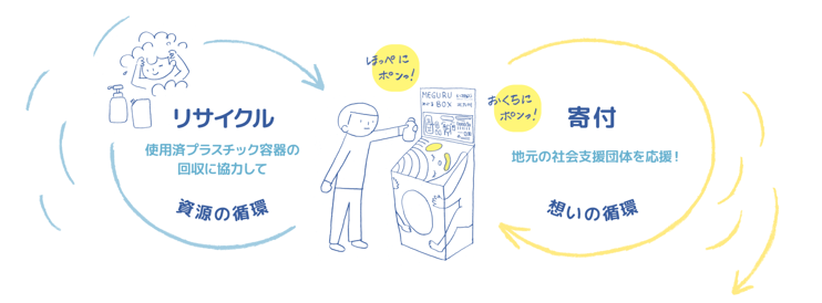 また、回収品1個につき、5円(1日上限15円)が社会支援団体に寄付され、地域社会における、資源の循環と、想いの循環を生む新しい回収のスキームを目指します。