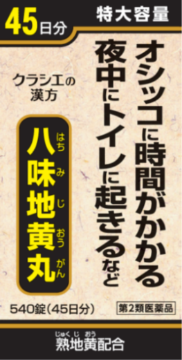| 成分 | 成人1日の服用量12錠(1錠305mg)中 ジオウ(熟ジオウ)末…890mg、サンシュユ末…445mg、サンヤク末…445mg、タクシャ末…334mg、ブクリョウ末…334mg、ボタンピ末…334mg、ケイヒ末…111mg、ブシ末…111mg 添加物として、ヒドロキシプロピルセルロース、ハチミツ、ポビドン、ステアリン酸Mg、ケイ酸Al、白糖を含有する。 |