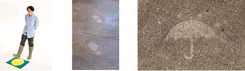 レインアートの中には、「ふしぎな雨男」の長靴の足跡があります。実際に、長靴を履いた高橋一生さんに足型をとらせていただきました。ぜひ会場にて、高橋一生さんの足跡を探してみてください。