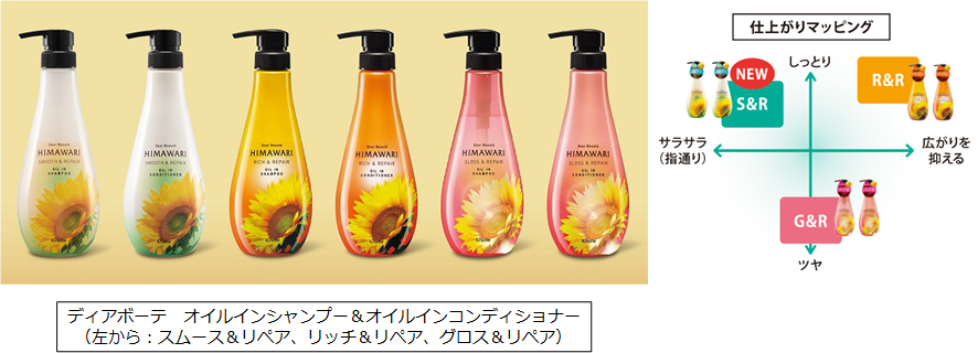 「ディアボーテ HIMAWARI」は、“年齢による髪のうねり、くせ、パサつきの原因となる「髪のゆがみ」を整え、素直な髪に導く”をコンセプトに、シャンプー、コンディショナーなどのインバス商品からアウトバストリートメント商品まで展開しています。インバス商品は、指通りさらりとまとまる「スムース&リペア」、広がりを抑えてしっとりまとまる「リッチ&リペア」、毛先までツヤのある手触りのよい髪に導く「グロス&リペア」の3ラインです。