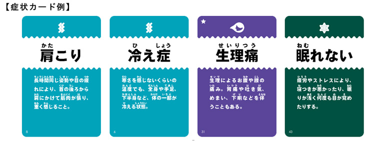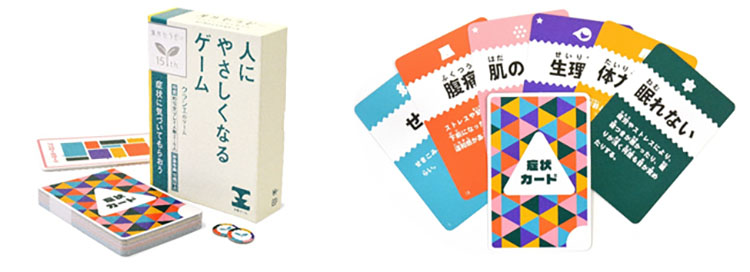 2006年に誕生した『漢方セラピー』は、今年で15周年を迎えます。生活や価値観が急速に変化する中で、誰もが“自分らしい”生き方をできる社会になってほしい、という想いを込めて、クラシエ薬品として初めて、カードゲーム「人にやさしくなるゲーム」を企画・開発しました。これまであまりコミュニケーションの対象とされてこなかった身体の「症状」や「お悩み」について考える内容となっています。このゲームは、プレイヤーが「体調不良の人」と「まわりの人」とに分かれ、自分の身体の不調に気付いていない設定の「体調不良の人」が、「まわりの人」からかけられる【セラピーワード】※をヒントにして、自分の症状に気がつくことを目指すゲームです。