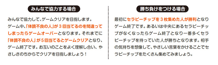 「体調不良の人」は、「まわりの人」がかけてくれる【セラピーワード】をヒントに、症状リストを見ながら、自分が持っている「症状カード」が何かを回答します。 回答できるのは1回だけです。「体調不良の人」が、自分の「症状カード」を当てることができたら、成功です。成功してもしなくても、「体調不良の人」は、「この人の言葉はやさしかったな」「症状にうまく気づかせてくれたな」と思う人に対して、セラピーチップを1枚わたします。「体調不良の人」の役を交代しながらこれを繰り返します。ゲームはみんなで協力するパターンと、勝ち負けをつけるパターンがあるため、好みのルールで遊んでください。