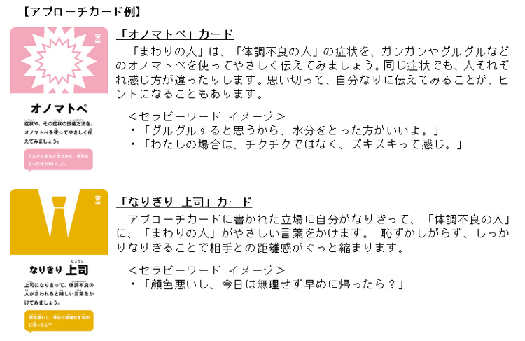 「まわりの人」は、9種類のアプローチカードに基づいた方法で「体調不良の人」へ【セラピーワード】をかけます。アプローチカードには、「体験/共感」や「オノマトペ」「気遣い」などのほかに、上司や子供、恋人になりきって声をかける「なりきり」カードもあるため、様々なアプローチで声をかけてみましょう。ただし、【セラピーワード】をかけるとき、症状名が含まれる単語は使用できないので注意が必要です。