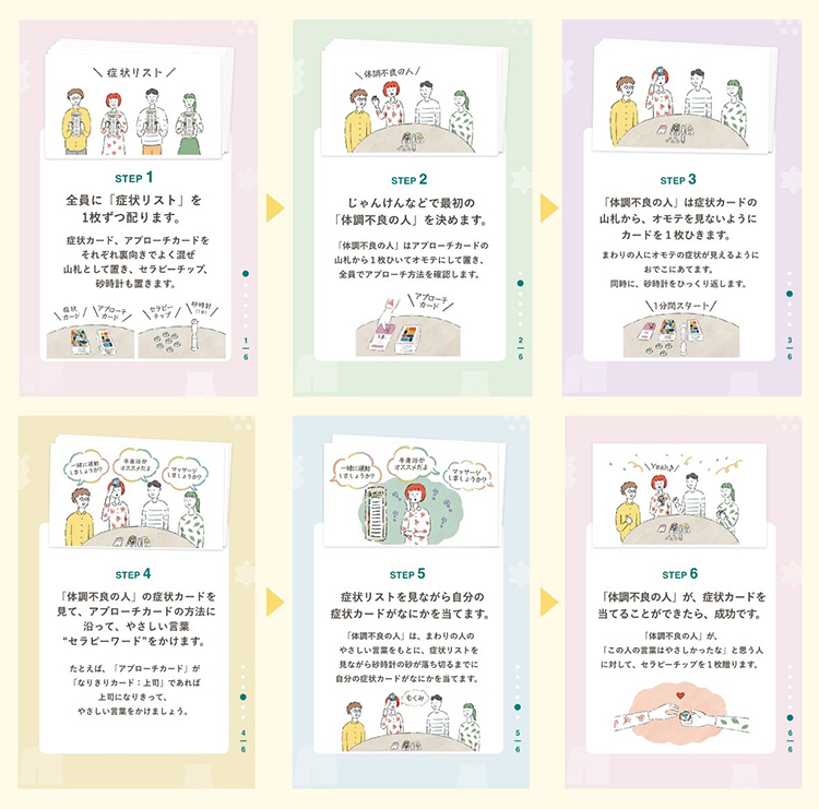 「人にやさしくなるゲーム」は、「体調不良の人」が「まわりの人」から声がけされる【セラピーワード】をヒントにして、自分の症状に気がつくことを目指すゲームです。ゲームは下記6つのステップで進められます。