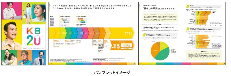 医師や医療関係者の皆様に向けて、「KB2スティック」20年の歴史や『コロナ禍における“暮らしの不調”実態調査』の結果、“暮らしの不調”の症状についてまとめたパンフレットを制作しました。また、1日2回服用と1日3回服用の違いによる服薬コンプライアンスの比較など、医師の皆様が漢方薬を処方する際の参考になるようなエビデンス資料も紹介しています。本パンフレットは医療従事者を対象に全国の医療機関や調剤薬局などに配布します。