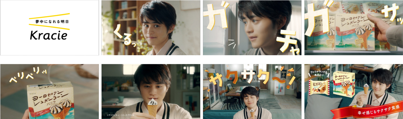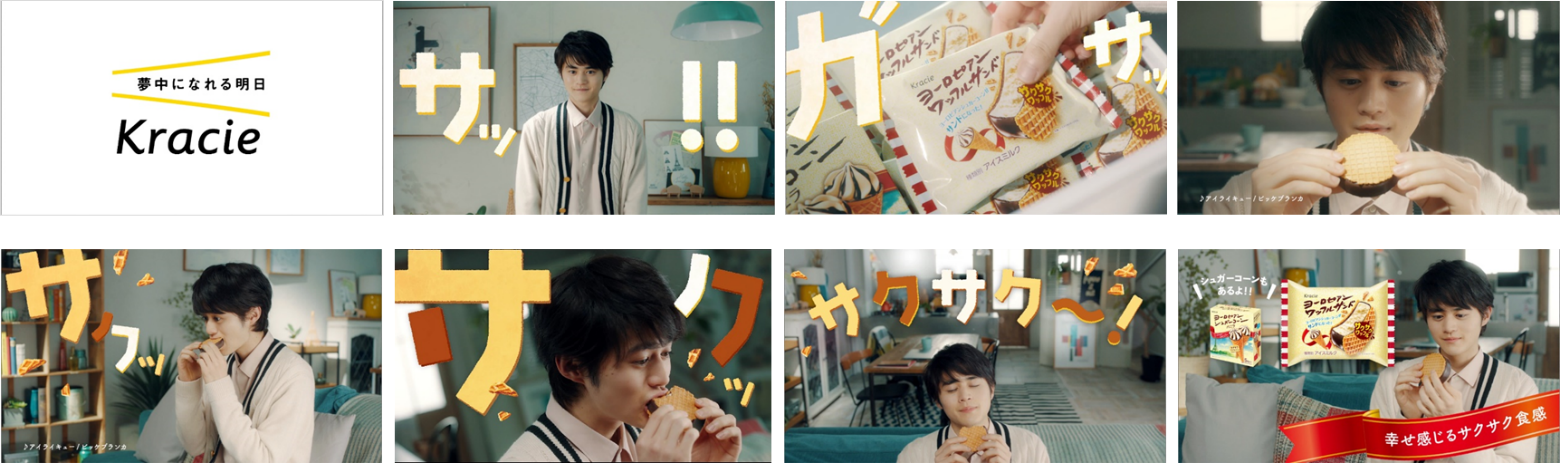 「幸せ感じるサクサク食感」をキャッチコピーにプロモーションを展開。俳優の鈴鹿央士さんをイメージキャラクターに起用したTVCMが3月21日より放映。TVCMはワッフルサンド編とシュガーコーン編の2種類。