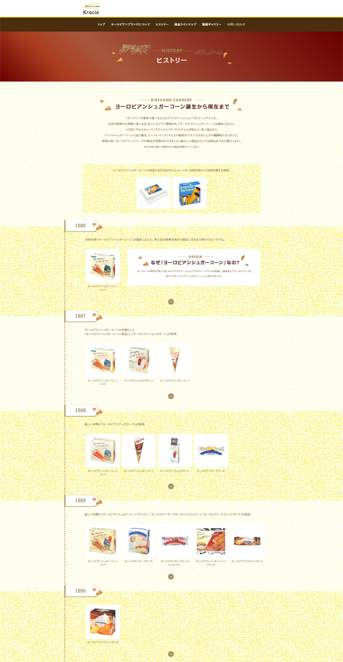 新たにヒストリーページが作られ、1986年の発売時から現在までのヨーロピアンシュガーコーンのパッケージ変遷やヨーロピアンシリーズとして発売された歴代の商品を見ることができます。懐かしいパッケージやレアな限定商品もありますので、是非見つけてみてください。