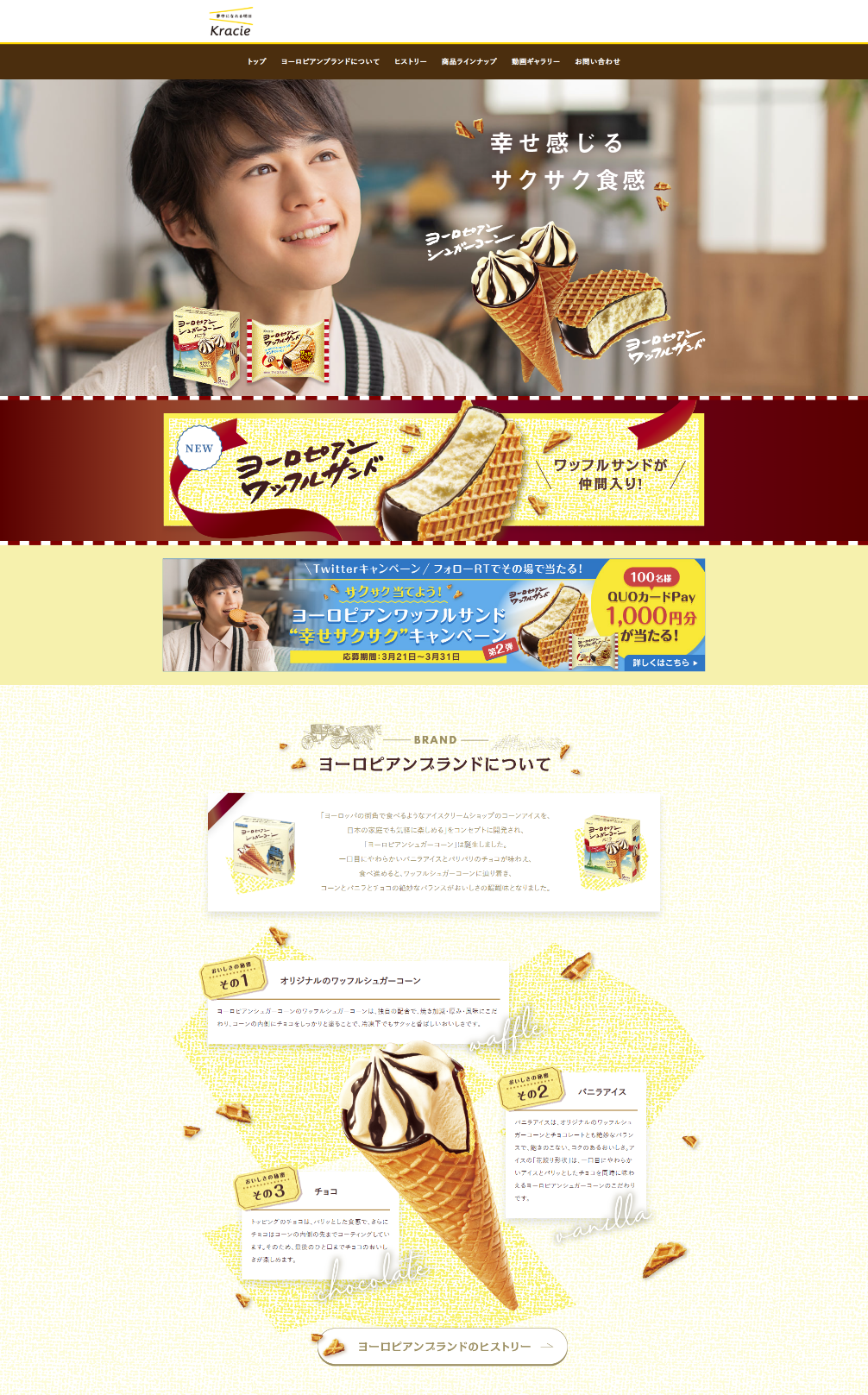 ヨーロピアンシリーズのブランドサイトがリニューアルされました。TOPページにはイメージキャラクターの鈴鹿央士さんと定番のヨーロピアンシュガーコーン、新商品のヨーロピアンワッフルサンドが並び、ヨーロピアンシリーズの世界観を感じられます。