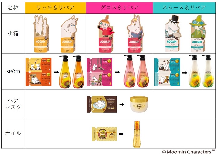 「ディアボーテ HIMAWARI」が「ムーミン」とコラボレーションした限定デザイン商品は、おかげさまで多くのお客様に毎回ご好評いただいております。シャンプー・コンディショナー(以下、SP/CD)3ラインの違いや、トリートメントの「ゆがみディープリペアマスク」と「プレミアムトリートメントオイル(モイスト)」を楽しくお試しいただけるよう、今回はSP/CD3ラインに各2種、計6種のムーミンキャラクターを小箱にデザインしました。小箱には、トライアルサイズが2回分ずつ入っているので、インバスヘアケアからアウトバスヘアケアまで一連使いで「髪のゆがみケア」ができます。また、トライアルサイズは“チケット”に見立てたデザインで、シャンプーからヘアオイルまで1つずつちぎって使い進めて心が弾むヘアケアタイムをお約束します。