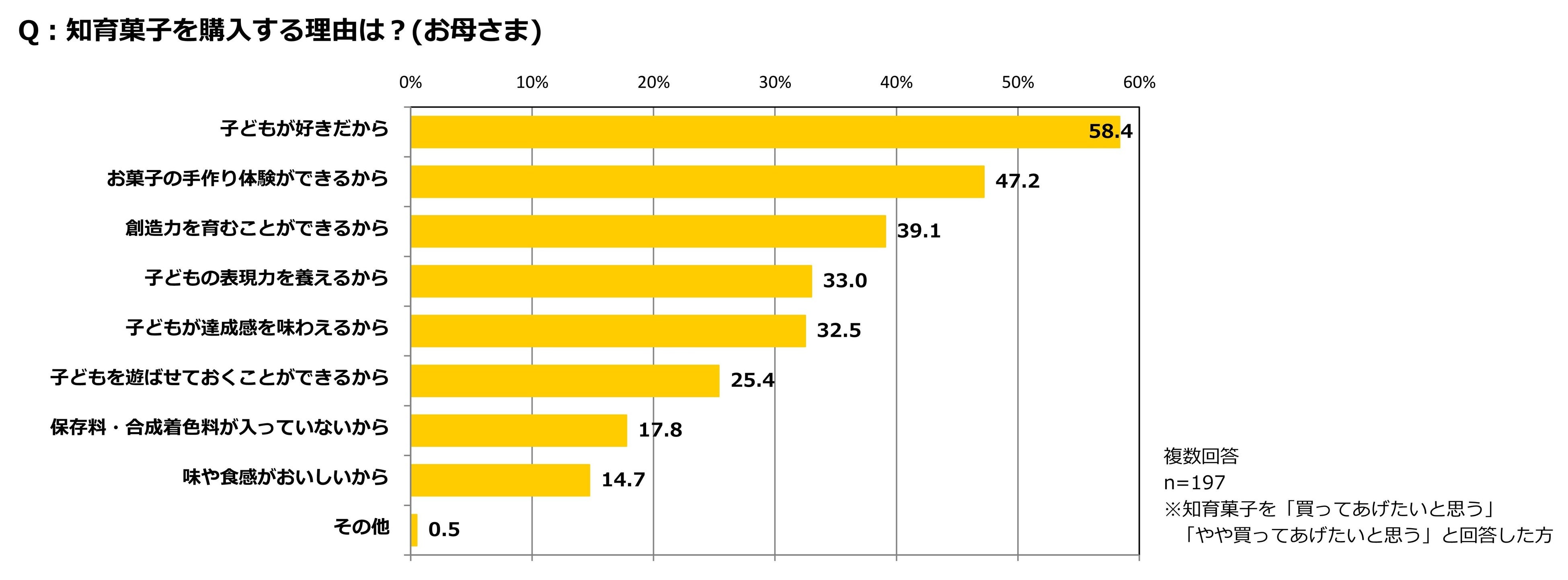 また、知育菓子を購入する理由を尋ねたところ、最も多かった理由は「子どもが好きだから」(58.4%)で、以下、「お菓子の手作り体験ができるから」(47.2%)、「創造力を育むことができるから」(39.1%)と続いた。