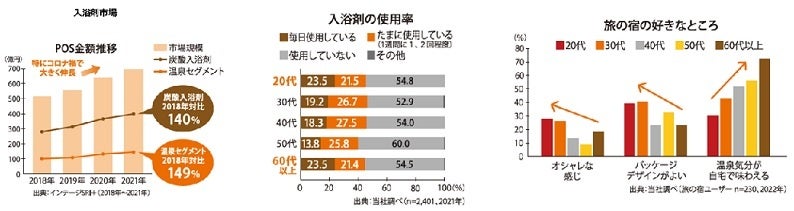 2021年の入浴剤市場は、2018年対比で127%と拡大しています。その中でも温泉セグメントは149%、炭酸入浴剤は140%と、市場と比べて大きく成長を続けています。当社の調査によると、入浴剤を毎日使用しているのは、20代と60代以上が多いことが分かりました。また、「旅の宿」は50代、60代には「温泉気分が気軽に自宅で味わえる」ことが評価されている一方、20代には、昨今の“レトロ可愛いブーム”の中、「旅の宿」のアイデンティティでもある版画のパッケージが好まれていることも分かっております。