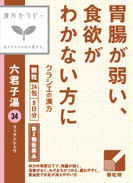 効能:体力中等度以下で、胃腸が弱く、食欲がなく、みぞおちがつかえ、疲れやすく、貧血性で手足が冷えやすいものの次の諸症:胃炎、胃腸虚弱、胃下垂、消化不良、食欲不振、胃痛、嘔吐