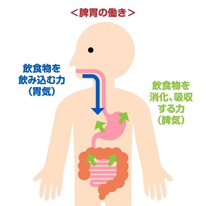 夏場の胃腸トラブルの代表「食欲不振」は、飲食物を飲み込み消化する「脾胃」の働きが低下したり失調するために起こると考えられています。脾胃の働きを支えるエネルギー(気※3)が充実していると胃腸も健康な状態でいられるとされています。また、胃腸が健康な状態になれば、体の中で全身のエネルギーが満ちて体の各部位にエネルギーが届き疲労倦怠の改善に繋がります。