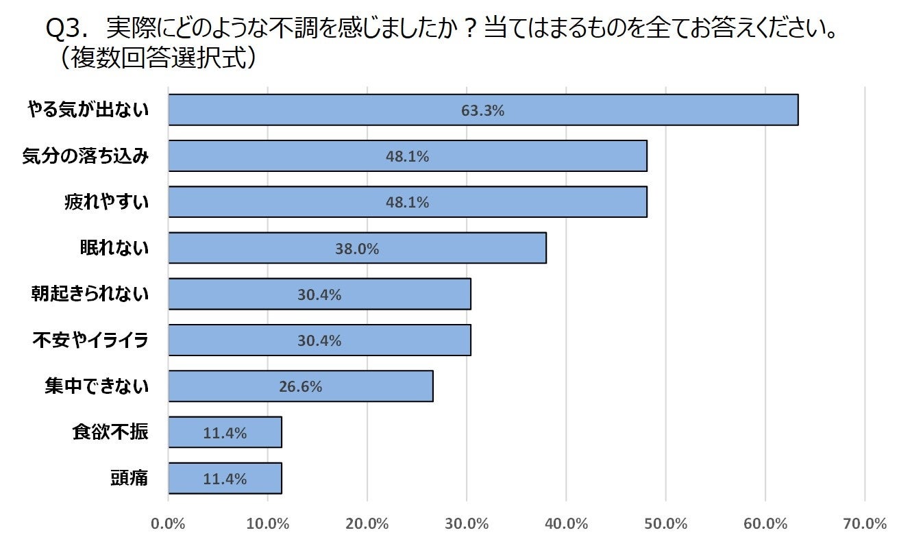 一方、身体面では、「疲れやすい」(48.1%)に加え、「眠れない」(38.0%)、「朝起きられない」(30.4%)といった睡眠に関連した不調も多くの人が経験していることが分かります。