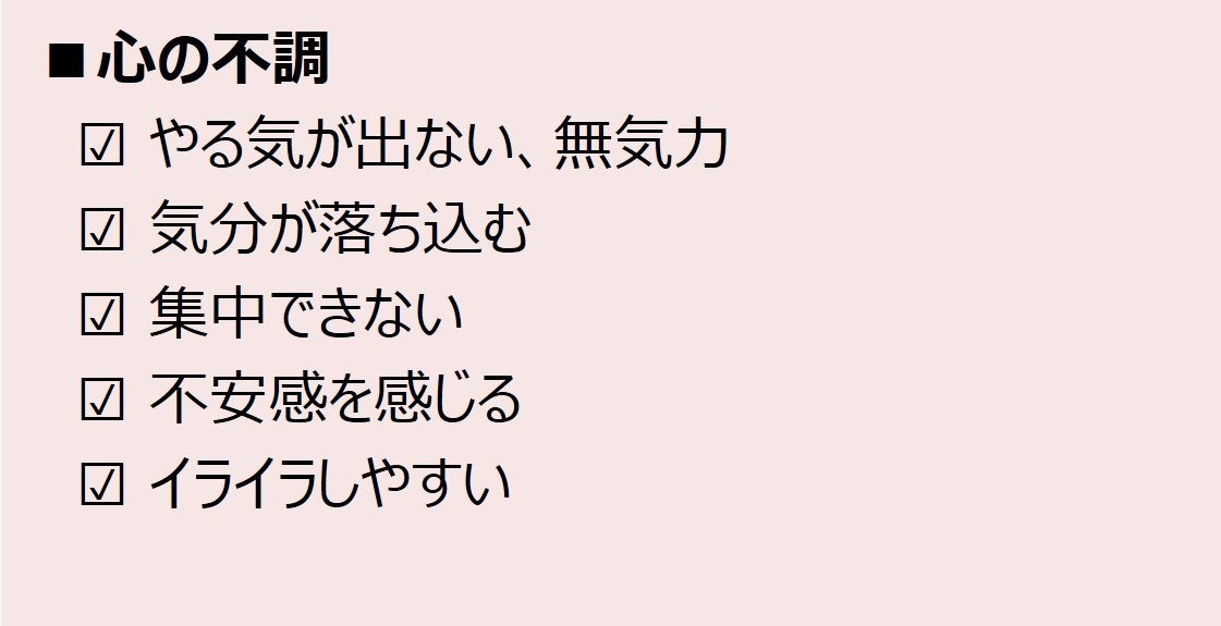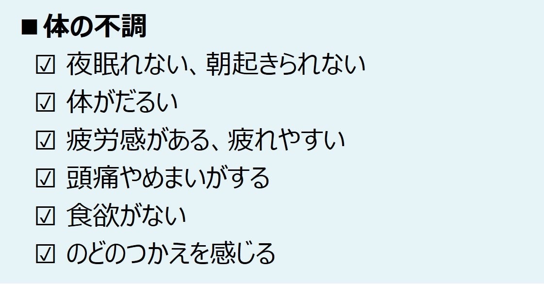『9月病』には「不眠」や「気分の落ち込み」など様々な症状がありますが、体と心それぞれの不調があります。下記の症状やポイントが、複数当てはまったり、長期間に続く場合には注意が必要です。