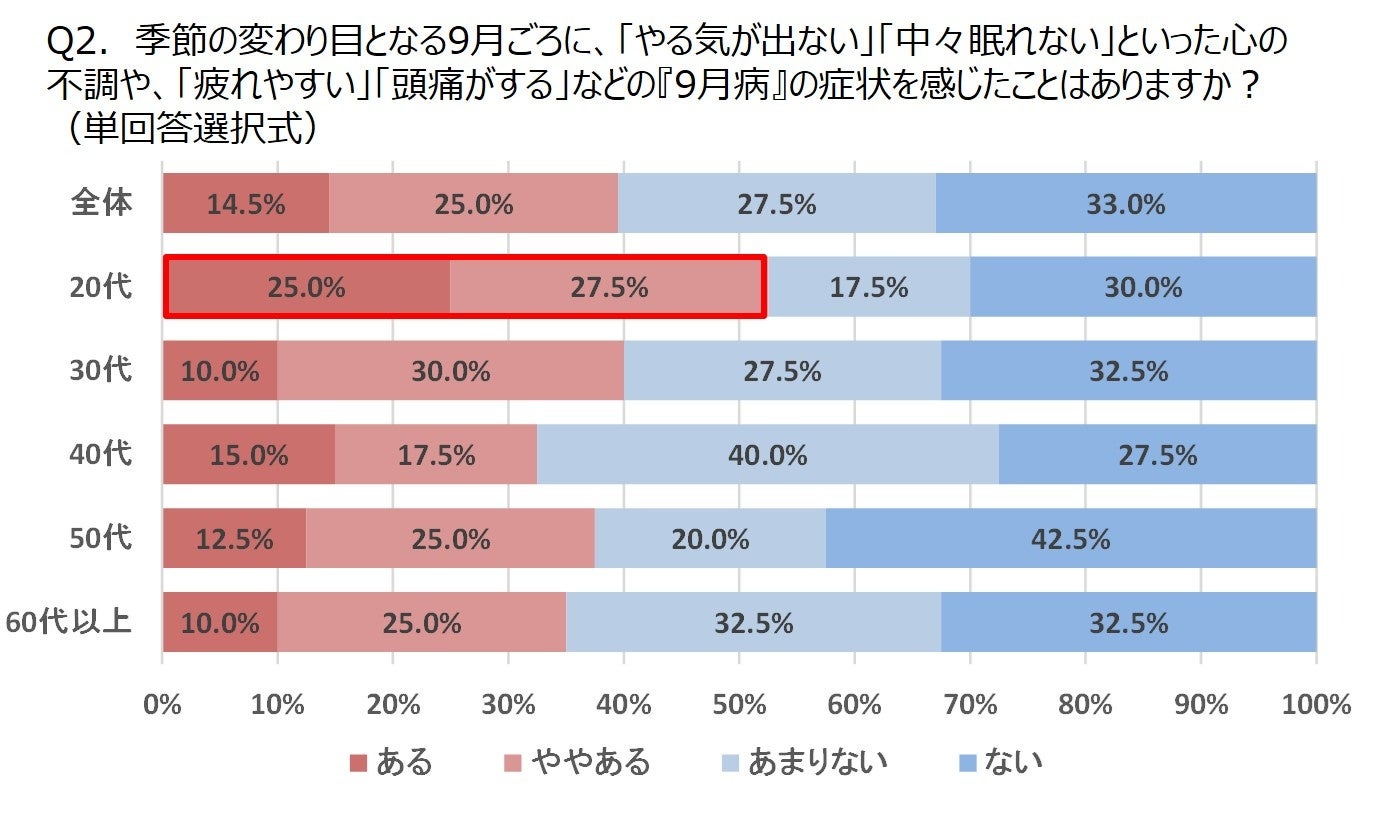 『9月病』とは、夏休みが明けて仕事や学校が始まる9月の時期に、急激な温度変化も影響して心や体の調子を崩してしまい、仕事や学業にうまく復帰できないことを指します。当社が行った調査では、『9月病』の認知度はわずか16.5%でしたが、実際に不調を感じたことがある人は約4割にも上る結果となりました。特に若い世代の方が経験率が高く、20代では52.5%と、2人に1人は『9月病』の症状を感じたことがあると回答しました。