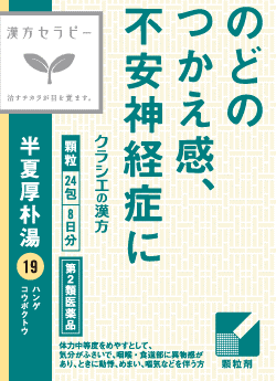 効能:体力中等度をめやすとして、気分がふさいで、咽喉・食道部に異物感があり、ときに動悸、めまい、嘔気などを伴う次の諸症:不安神経症、神経性胃炎、つわり、せき、しわがれ声、のどのつかえ感
