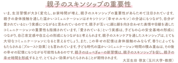 親子のスキンシップの重要性は、いま、改めて注目されています。玉川大学教育学部の大豆生田(おおまめうだ)教授は、「親子のほっぺぎゅーの新習慣は、親子のスキンシップを促し、親子の幸せ時間を形成する上で、とてもよい効果がもたらされることが期待される」とコメント。“ほっぺぎゅー”をきっかけに、スキンケアデビューをする親子、スキンケアで健やかな肌になって、自然と“ほっぺぎゅー”のスキンシップがたのしみになる親子、どちらも「マー&ミー」は応援します。賞品の「mä&më ヘアバンド」は肌も髪もやさしく包み込むマイクロコットン🄬を使用し、日々のスキンケアが心地よい時間となるようこだわりました。