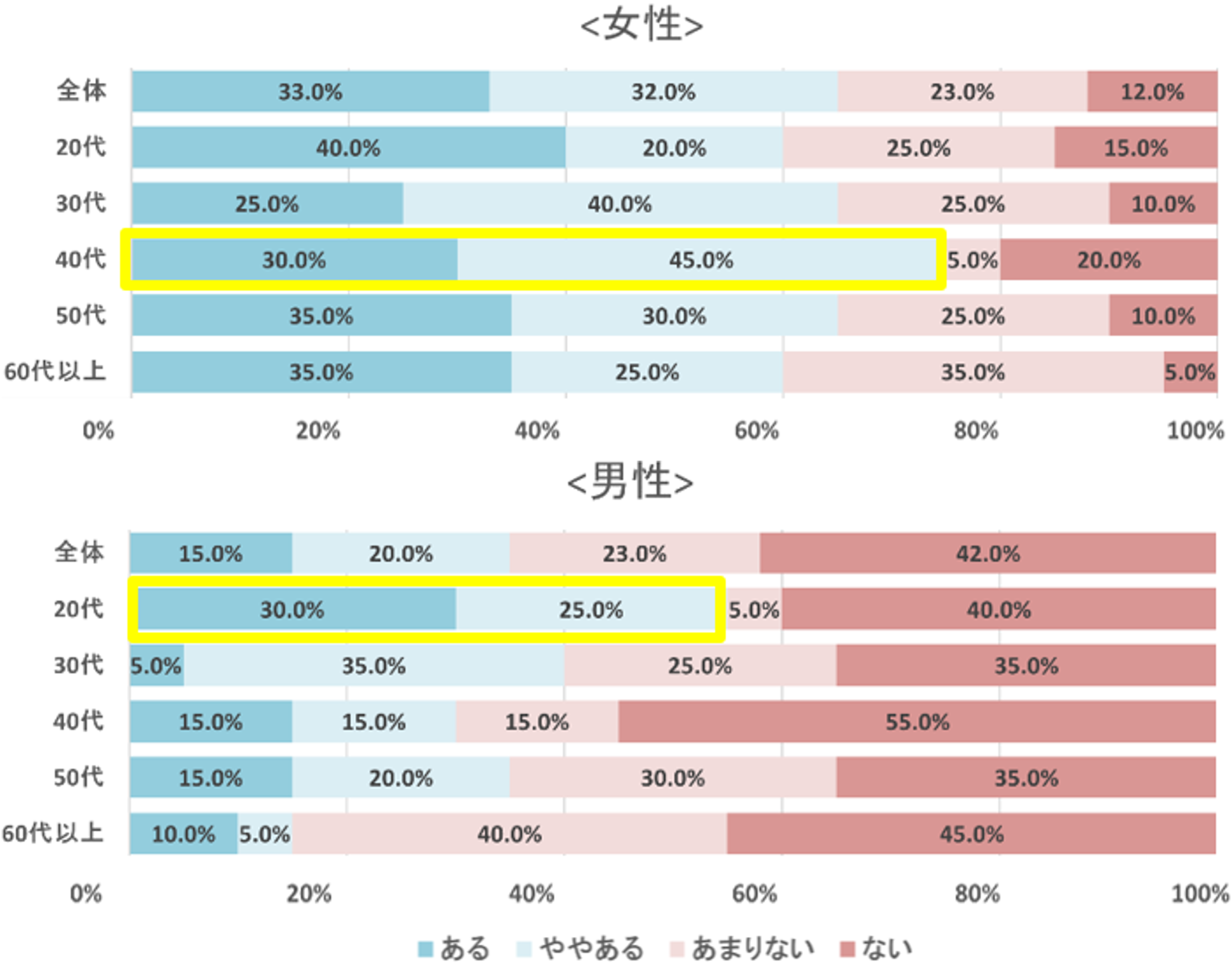 また、冷え症を実感している男性は全体で35%にとどまり、男性よりも女性の方が冷え症を実感していることがわかる結果となりました。その中でも20代は55%と半数以上が冷え症を実感しており、世代別でも異なる結果となりました。