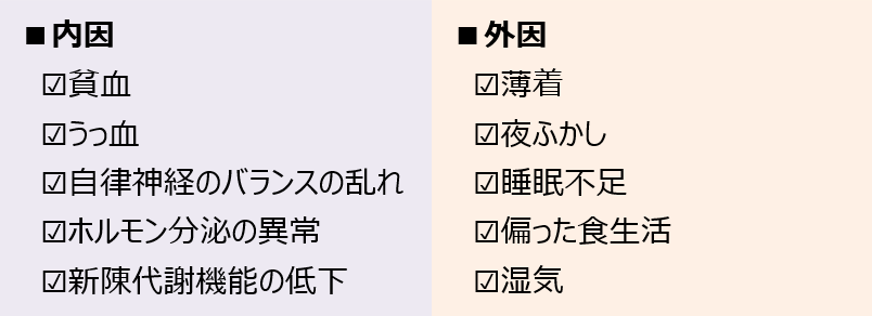 冷え症は、血行不良により、末端の血管が収縮してしまい、毛細血管まで血液が巡らないために生じます。自律神経や心臓、筋肉などのはたらきが関係していると考えられており、大きく内因と外因の2つに分けられるといわれています。