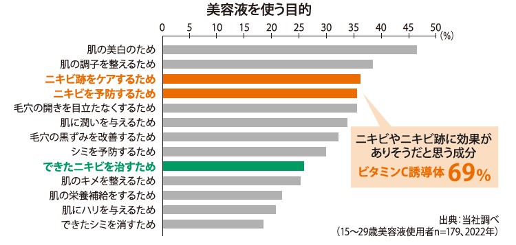 当社の調査によると、20代女性の美容液の使用率は大きく伸長しています。美容液を使う目的の上位に、「ニキビ跡をケアするため」、「ニキビを予防するため」が挙げられ、ニキビやニキビ跡に効果がありそうな成分に「ビタミンC誘導体」と回答する方が多いことが分かりました。
