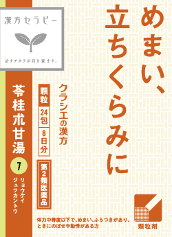 効能:体力中等度以下で、めまい、ふらつきがあり、ときにのぼせや動悸があるものの次の諸症:立ちくらみ、めまい、頭痛、耳鳴り、動悸、息切れ、神経症、神経過敏