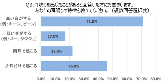 耳鳴りの音は、周囲から聞こえる音ではなく、体の中で発生している雑音です。人間の体は、内耳にある蝸牛内の有毛細胞が音の振動を電気信号に変換して脳へ届けることで音を認識しています。しかし、その途中に機能障害が起きると音を認識しづらくなります。耳鳴りの症状は「自覚的耳鳴り」と「他覚的耳鳴り」に分けられます。脳が音の不足を感じて不足した音を補うために本来はない音を作り出すものを「自覚的耳鳴り」、耳周辺の組織から発生する音を「他覚的耳鳴り」と言い、それぞれ聞こえ方も異なります。耳鳴りを感じたことがあると回答した方に、耳鳴りの特徴を尋ねたところ、「キーン、ピーン」といった高い音と回答した方が約7割、片耳だけで起こると回答した方は約5割となり、耳鳴り感じる音や不快感には個人差があることが分かりました。