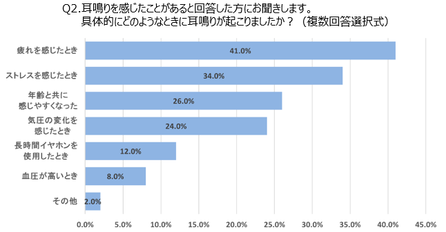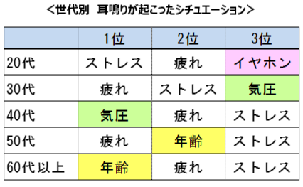50代・60代以上では「年齢と共に感じやすくなった」が上位となり、加齢により耳鳴りを感じる割合が高くなっている様子がうかがえます。また、世代別の結果として特徴的なのは、20代のみ「長時間イヤホンを使用したとき」が上位に入っているほか、30代・40代は「気圧」が上位となり、世代間での傾向の違いが表れる結果となりました。