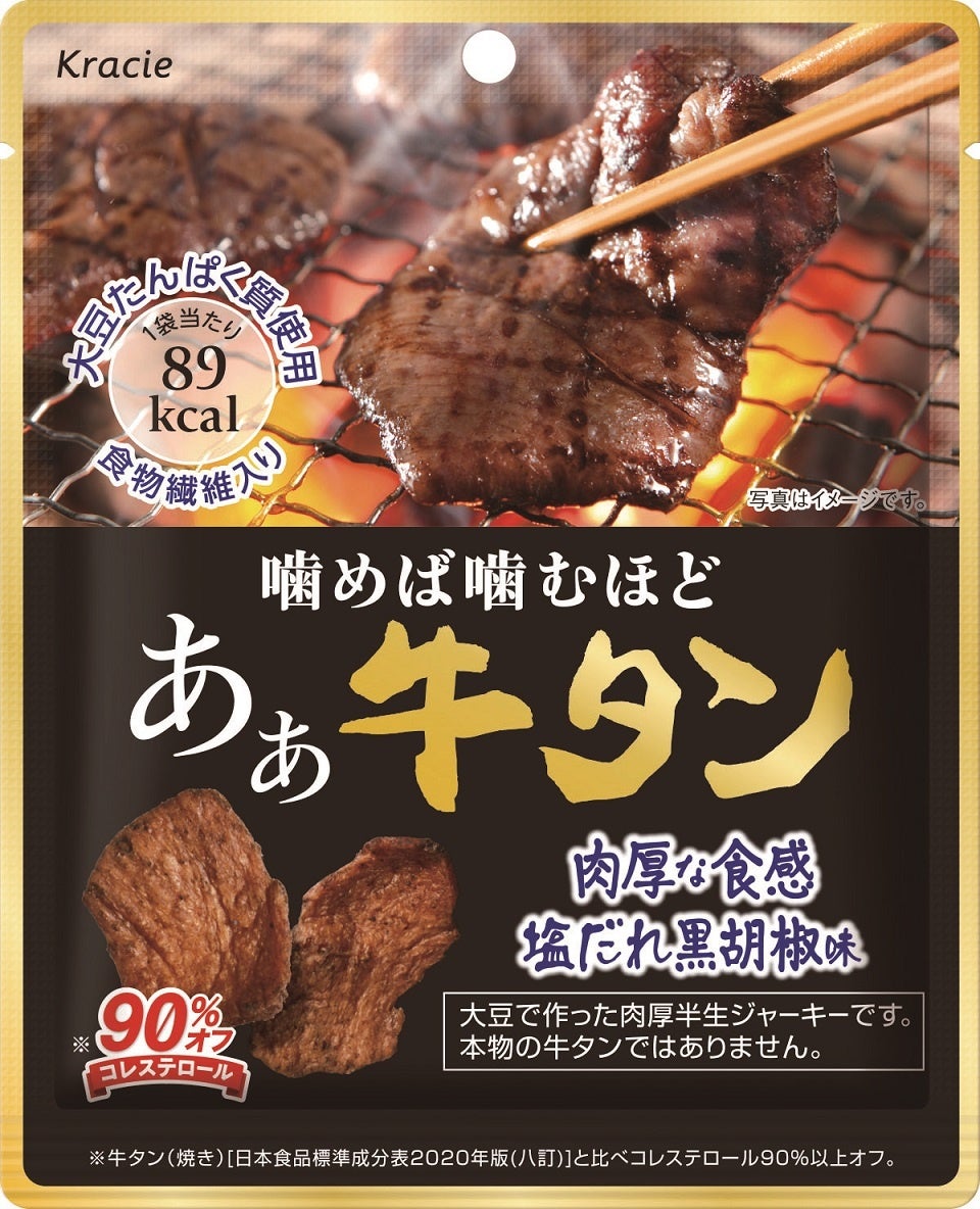 「あぁ牛タン」は、 独自製法で牛タンの肉厚な弾力と風味を再現した、大豆で作った半生ジャーキーです。塩だれ味をベースに、ガーリックと黒胡椒で濃厚な味わいに仕上げ、噛めば噛むほど口に広がるあと引く旨味が、お酒のおつまみにもピッタリです。大豆を主原料にしているので、牛肉を使用した場合と比較してコレステロールは90%オフ※、1袋89kcalと低カロリーで、ヘルシー志向の方にも罪悪感なくお楽しみいただける商品です。