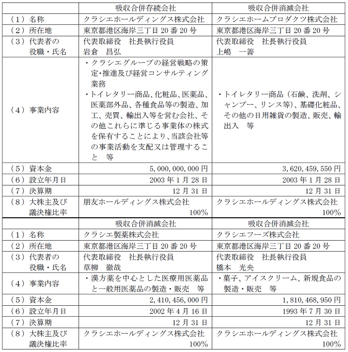 クラシエホールディングスを吸収合併存続会社とする吸収合併方式で、クラシエホームプロダクツ、クラシエ製薬、クラシエフーズは解散いたします。