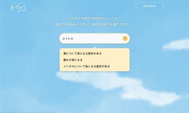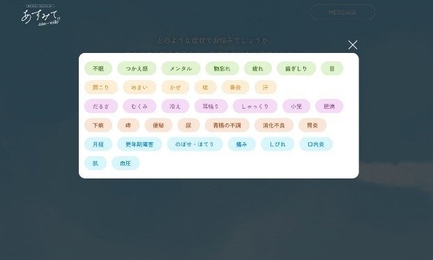 気になるお悩みを検索ボックスに入力すると、該当する症状を「あすみて(asu-mite)」からご提案。ご自身のお悩みに近い症状を選んで頂くと、チェックがスタートします。2-3問程度の質問にお答え頂くことで、気になるお悩みの症状におすすめの漢方処方がわかります。また、あらかじめ用意されている35種の症状から選択して質問に進むことも可能です。