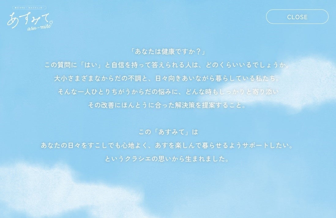 漢方薬を中心とした一般用医薬品と医療用医薬品を販売するクラシエ薬品株式会社は、漢方セラピーブランドから、一人ひとり異なるからだの悩みに寄り添うセルフチェックサービス「あすみて(asu-mite)」をクラシエ薬品ホームページ(URL:https://www.kracie.co.jp/ph/k-therapy/asumite/)にて、4月3日より提供開始します。