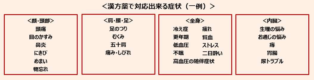 漢方薬には多くの処方がありますが、日本では、一般用漢方製剤として294処方が厚生労働省から認められています。294処方で対応できる症状は幅広く、顔・頭部、肩・腰・足、全身、内臓などさまざまな疾患に対応することが出来ます。現在は、セルフチョイスが可能なわかりやすい一般用漢方薬も発売されており、ご自身で自分に合う処方を見つけられる機会が広がっています。一方で、1つの疾患に対してその人の症状や体にあったいくつかの処方を組み合わせるケースもある為、漢方薬選びに迷ったら専門家への相談もオススメです。