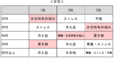 また、男女別に結果を見ると男性では30代から50代の働き世代で「ストレス」が1位となりました。さらに、「ストレス」から派生すると考えられる「不眠」や「胃腸の不調」に対する症状の改善意向も高く、心身の不調にお悩みの方が多い様子がうかがえます。 女性では20代から50代で、「女性特有の悩み」と「更年期」が上位にランクインしています。女性特有の疾患への漢方ニーズの高まりは、近年のフェムテックの盛り上がりなどが影響している可能性も考えられます。