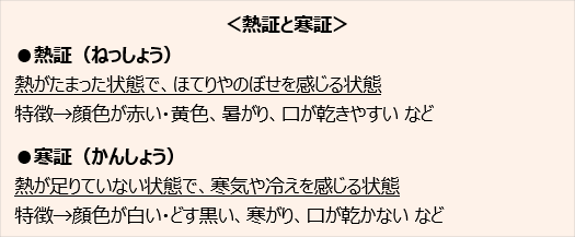 体を潤し熱をさます働きのある陰液(水分・栄養素)が不足することで、口・のどの渇きや乾いた咳などの症状や、のぼせ、手のひら・足の裏のほてり等が現れます。適度な水分摂取を心がけ、辛味の強い食べ物は控えるようにしましょう。