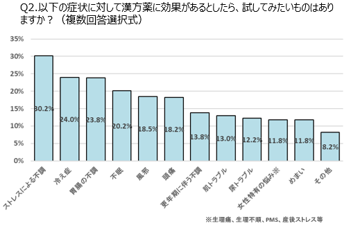 続いて、漢方薬に効果があるとしたら、試してみたいものを尋ねたところ、「ストレスによる不調」が最も多い回答となり、精神面の不調に対する漢方ニーズの高さが明らかになりました。また、「冷え症」、「胃腸の不調」に関しては前問と同様に上位にランクインしています。