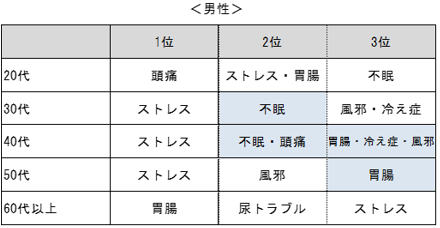 30~50代男性は「ストレス」に派生する「不眠」や「胃腸の不調」にも高いニーズが