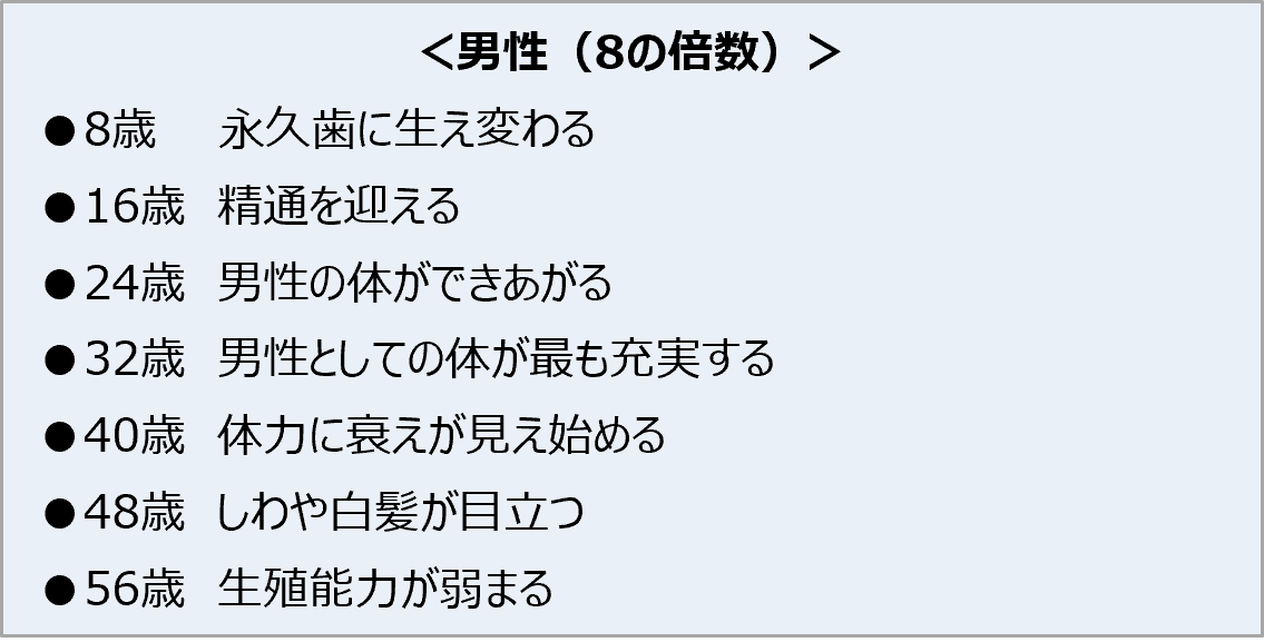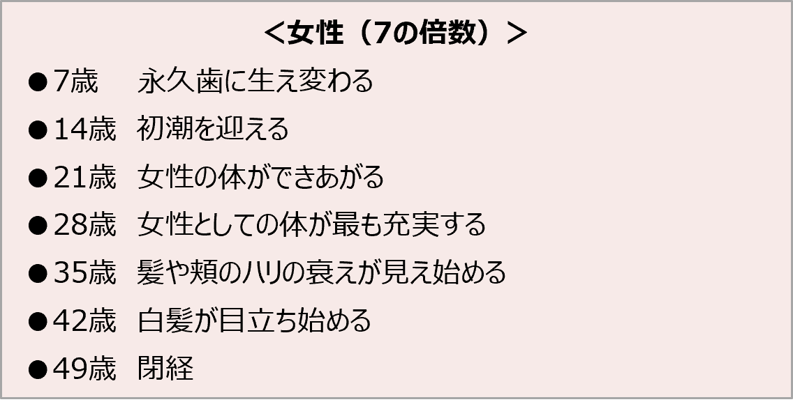 東洋医学の古典「黄帝内経(こうていだいけい)」によると、「女性は7の倍数」、「男性は8の倍数」の時に体に変化が訪れるとされています。女性は21歳、男性は24歳時に体が成熟し、さらに女性は28歳、男性は32歳時に、最も体が充実するとされており、以降は加齢と共に体にも問題が現れてきます。現在自身がどの段階にあり、今後どのような問題があるかを知ることで年代に合った対策をしてみましょう。