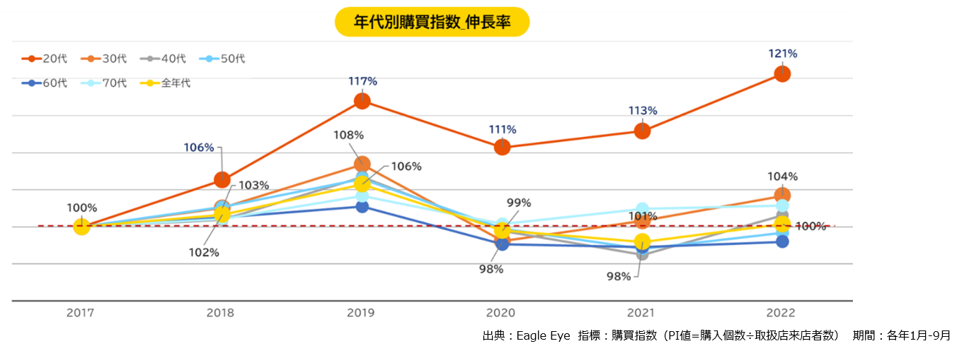 当社が2022年12月に発表した「KAMPO OF THE YEAR 2022」では、一般用漢方薬市場における、20代の若年層からの需要増加傾向が見られました。購入個数と来店者数を基に算出した購買指数(PI値)の変遷を示した下記のグラフでは、過去5年間で、20代の購買指数が突出して伸長していることが分かります。既存ユーザーの高齢者層だけでなく、漢方薬の需要は幅広い年代に広がっている様子が窺えます。