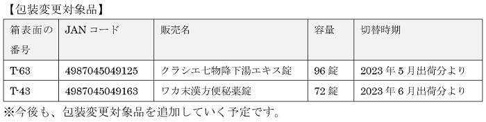 クラシエ薬品より発売中の漢方セラピーシリーズの錠剤製品につきまして、プラスチック使用量削減の観点から、包装仕様を変更いたします。
