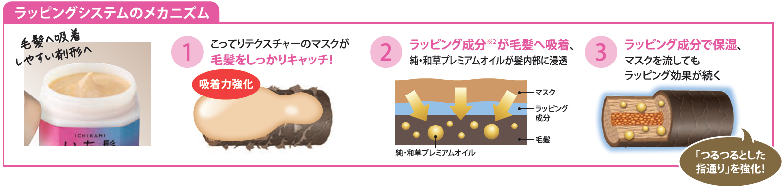 こってりとしたテクスチャーで吸着力がアップした、いち髪独自の「純・和草プレミアムオイル」配合のマスクが、ダメージ毛にしっかりと密着して髪内部に浸透し、ダメージを補修&予防します。マスクを流してもラッピング効果が続くので、スペシャルケアにおすすめです。