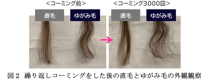 同一人物から入手した“直毛”と“ゆがみ毛”で作成した毛束について、繰り返し3,000回のコーミングを行い、その前後の各毛束の状態について観察しました。その結果、ゆがみ毛の方がコーミング後のまとまり感が低下し、うねりが増加している様子が確認できました(図2)。