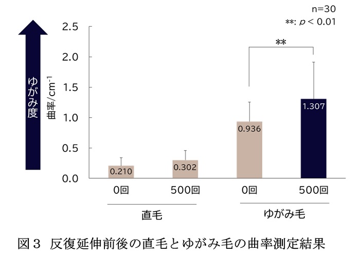 さらに、同一人物から入手した直毛とゆがみ毛について、テクスチャーアナライザにて一定の速度と応力の条件で反復延伸を行いました。形状解析レーザー顕微鏡を用いて得られた画像から、反復延伸(毛髪を繰り返し引っ張る行為)前後の各毛髪の曲率の観察と計測解析を実施しました。その結果、ゆがみ毛は500回の反復延伸によって有意に曲率が上昇したのに対して、直毛では反復延伸による変化が認められませんでした。この曲率の上昇が髪のまとまり実感の低下につながると考えられます(図3)。