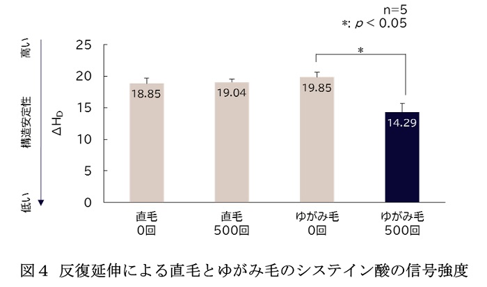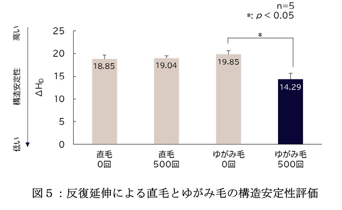 また、高圧示差走査熱量測定によって、反復延伸したゆがみ毛は構造安定性が低下していることも明らかとなりました(図5)。