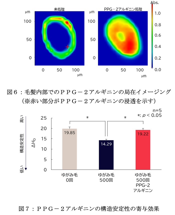 「反復延伸によるゆがみ毛の曲率の上昇」を抑制する成分について、さまざまな成分を探索した結果、「PPG-2アルギニン」が有効であることを発見。ゆがみ毛に「PPG-2アルギニン」を処理すると、毛髪内部まで浸透し(図6)、反復延伸によっても構造安定性が維持されることを確認しました(図7)。